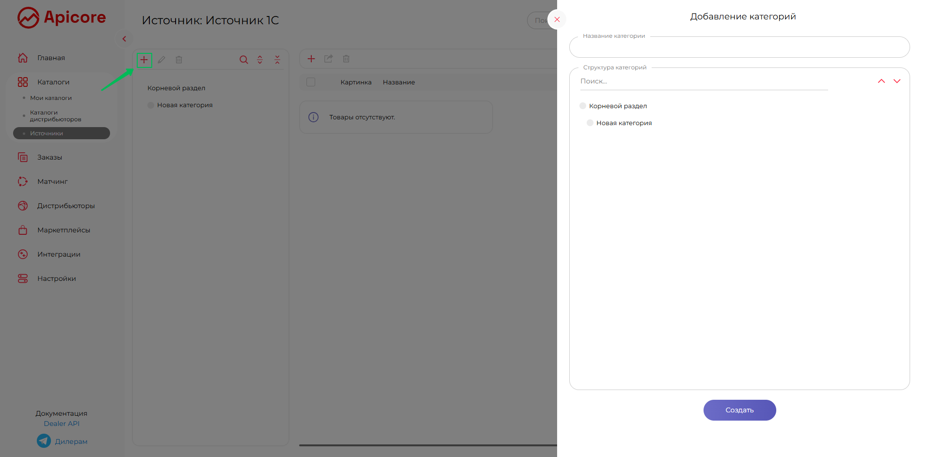 Вы можете настроить структуру категорий через интерфейс в разделе «Мои Каталоги». Однако мы рекомендуем воспользоваться импортом структуры категорий вместе с товарами через REST API. Это позволит избежать ручной привязки товаров к категориям после их импорта. Чтобы выполнить импорт каталога, сначала сгенерируйте API-ключ в разделе «Настройки» и следуйте инструкциям, представленным в документации