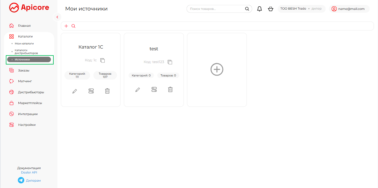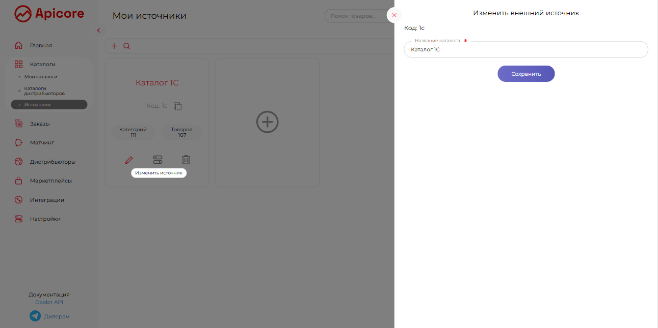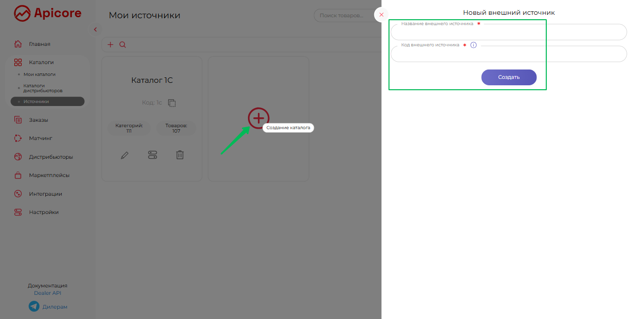 Подраздел «Источники» выглядит точно так же, как и «Мои Каталоги», но в этот раздел мы предлагаем вам импортировать или создать в кабинете данные с ваших внешних платформ, таких как ваша CRM, сайт и др.