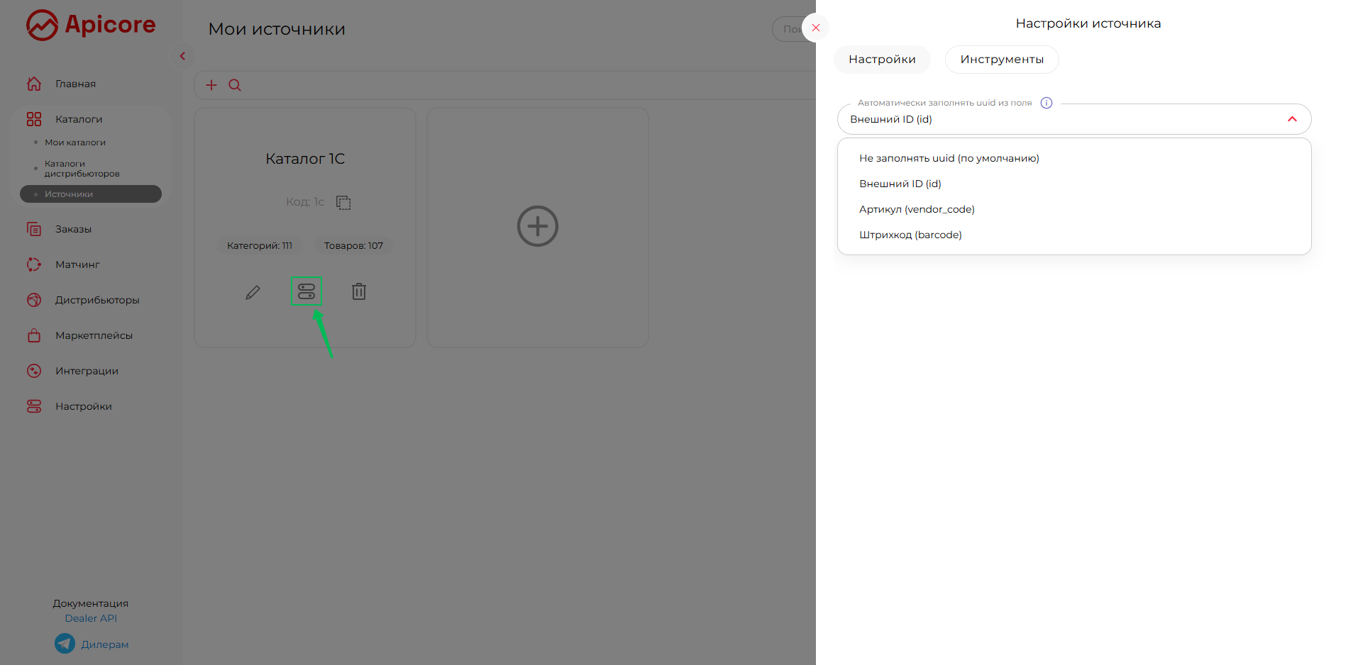 Если каталог синхронизируется с 1С, выбирайте «Внешний ID (id)».