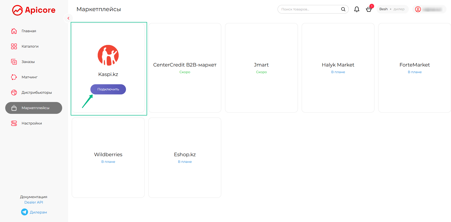 Этот раздел позволяет дилерам подключить свои каталоги к маркетплейсам, где у них есть магазины, и получать заказы (скоро).