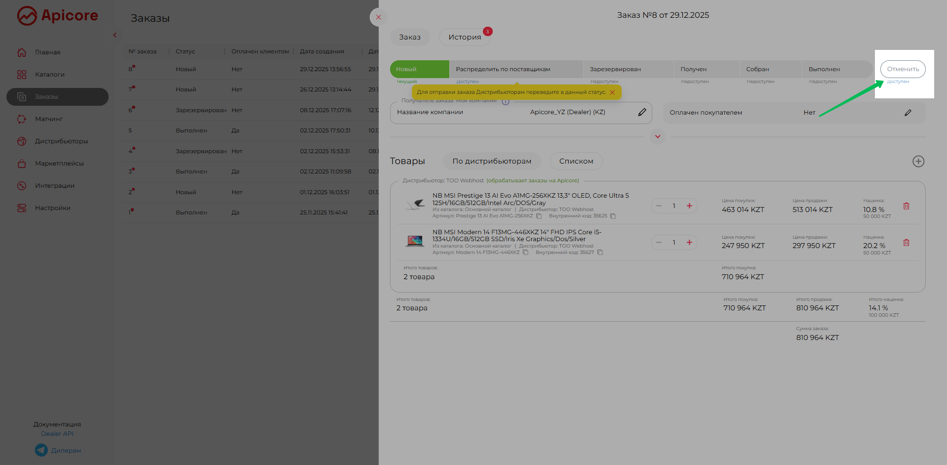 После подтверждения со стороны поставщиков заказ получает статусЗарезервирован.