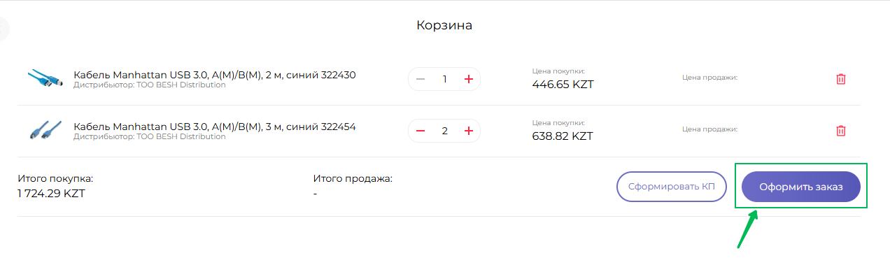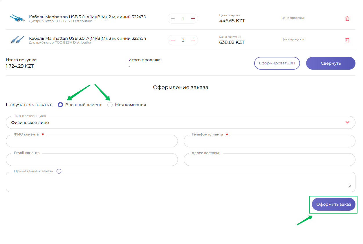 - На клиента (юр. или физ. лицо) — если заказ оформляется для покупателя (вашего конечного клиента)Нажмите на кнопку Оформить заказ
