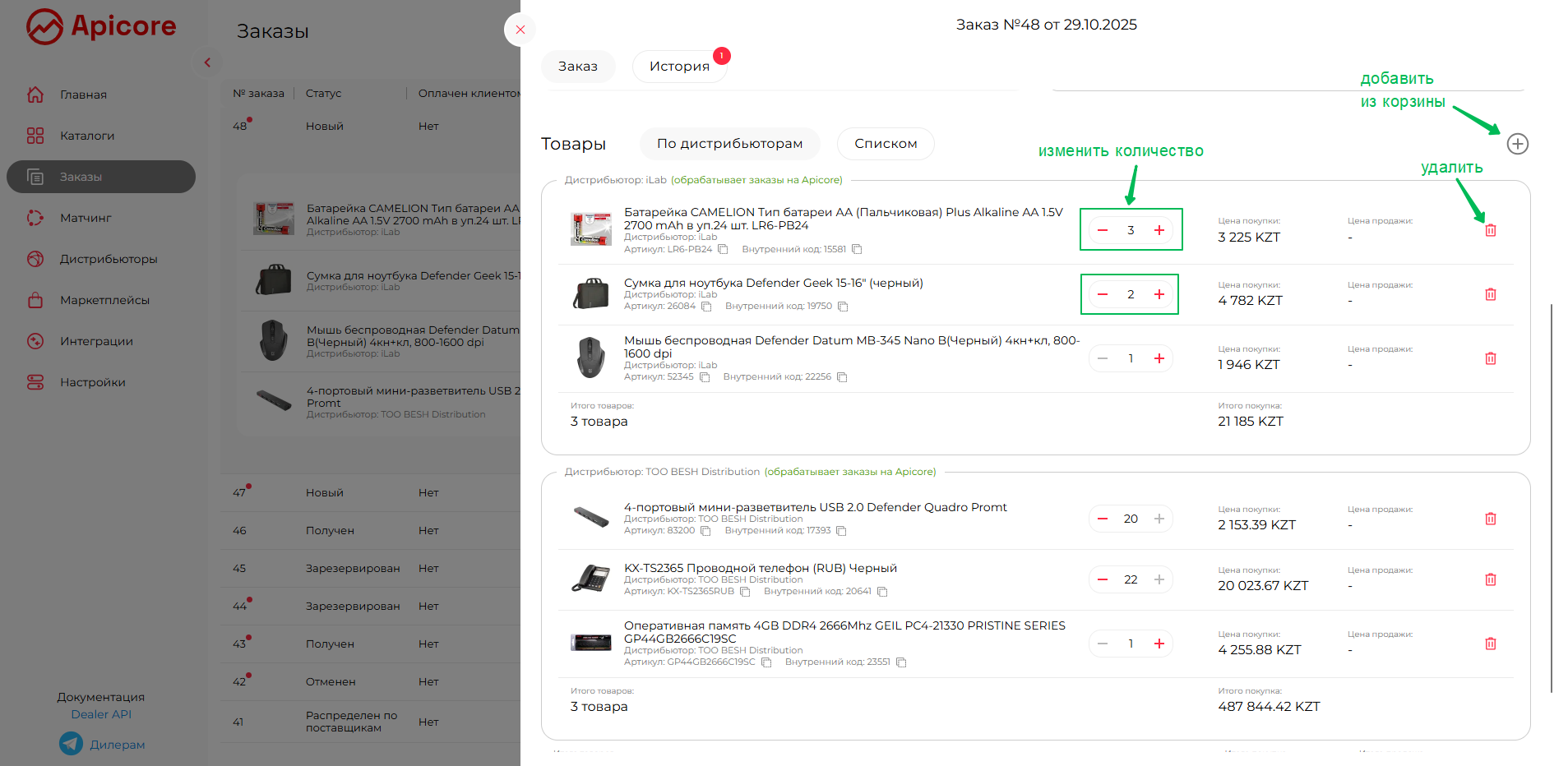 В этом разделе вы можете управлять заказами поставщикам/дистрибьюторам. Для этого: