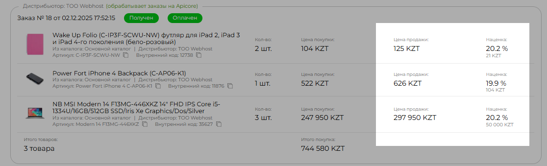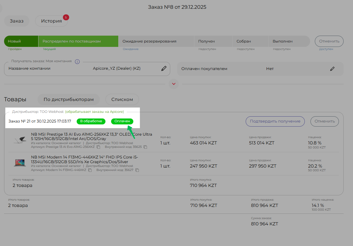 Каждый заказ поставщику имеет собственный статус «Оплачен».