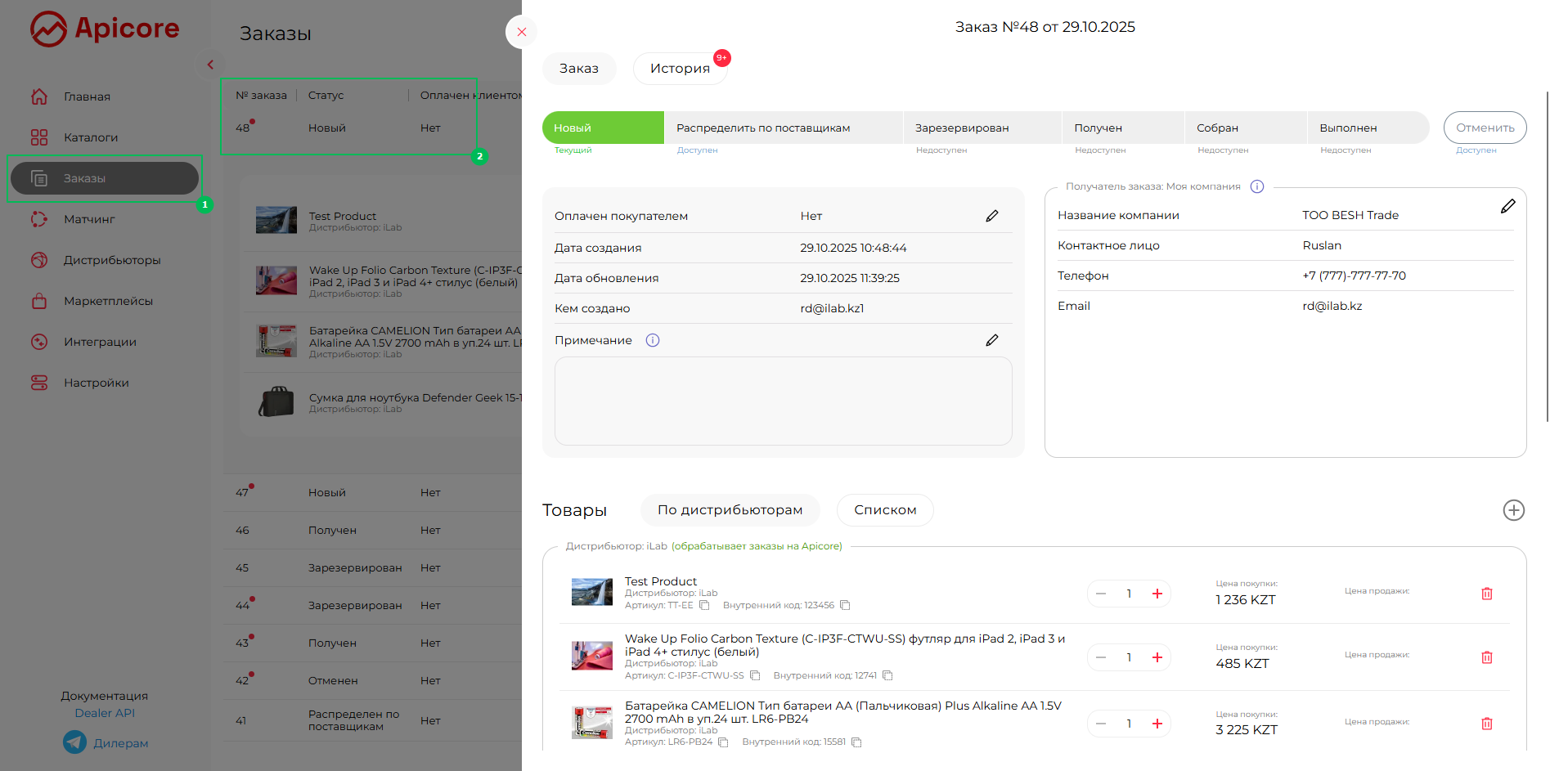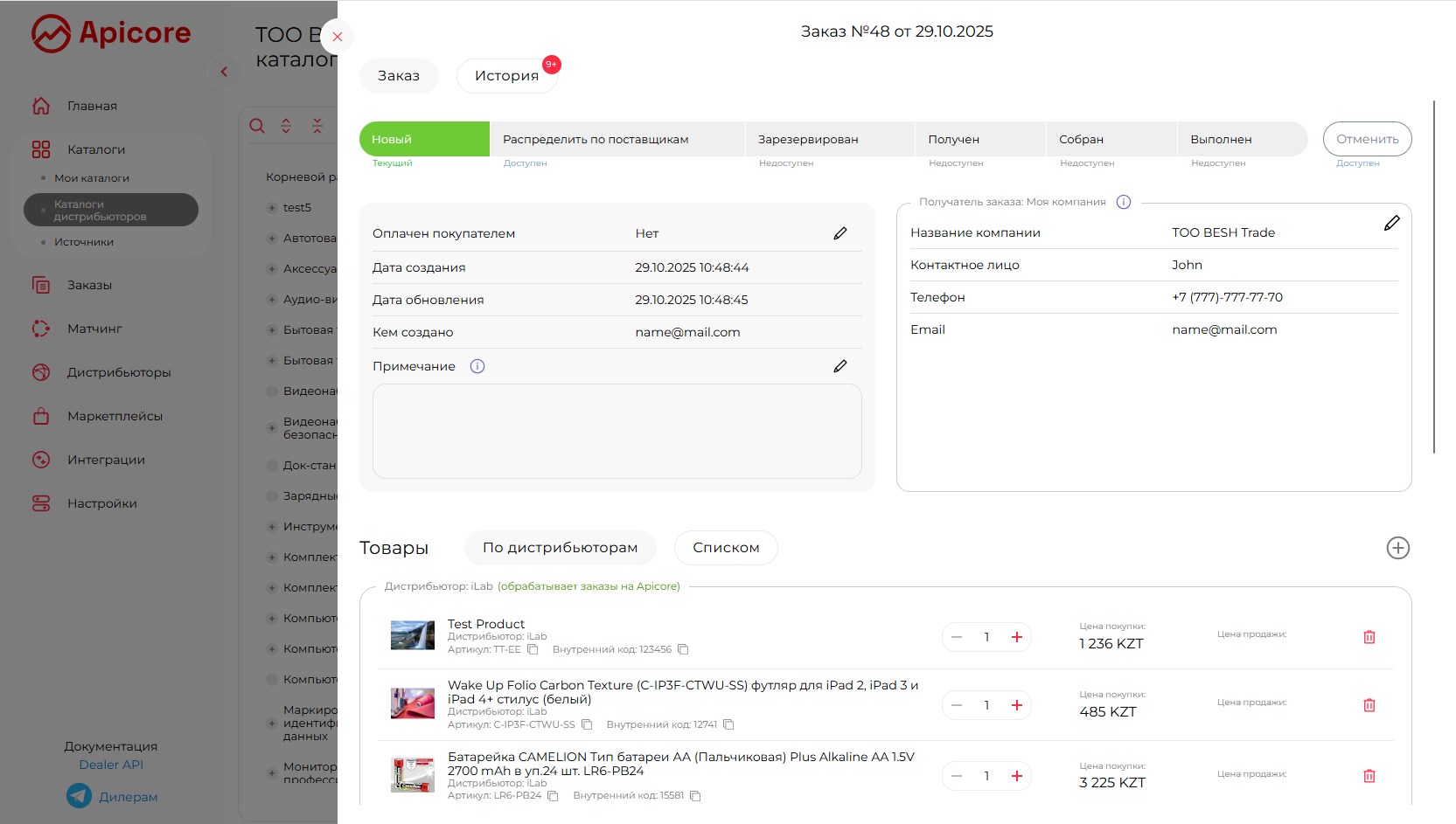 Apicore поддерживает функцию Сплитование заказов, которая автоматически распределяет товары в заказ по поставщикам. Например, если ваш заказ на сайте содержит Ноутбук и Монитор и это товары разных поставщиков, то в вашем заказе дилера они автоматически разделяться на два заказа поставщикам. Ноутбук одному поставщику, монитор другому. Вы увидите это разделение в карточке заказа.