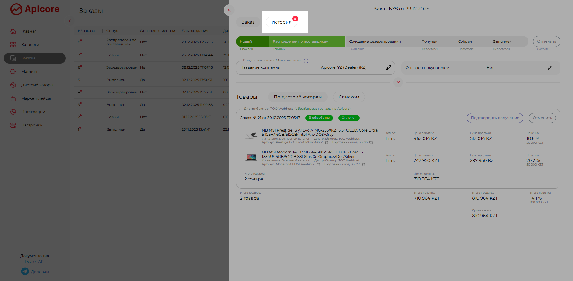 В разделе История фиксируются все изменения, связанные с конкретным заказом.