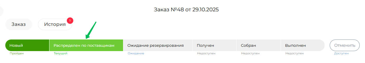 Если заказ собран верно переведите его в статус Распределить по поставщикам и ожидайте подтверждения резервирования от поставщиков (изменения статуса заказа).