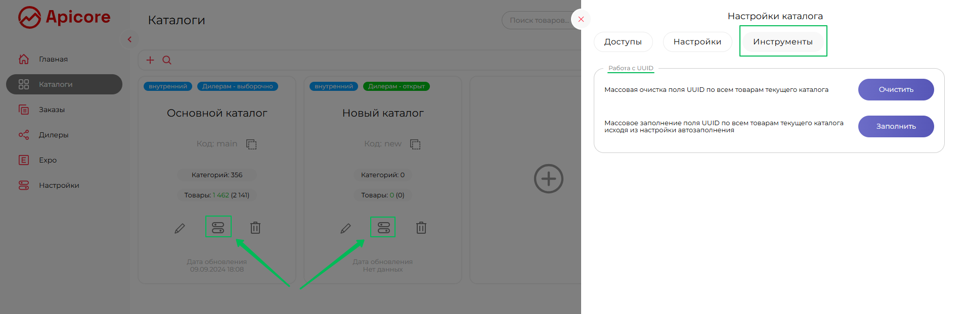 - Очистить — удаляет все UUID у товаров текущего каталога.