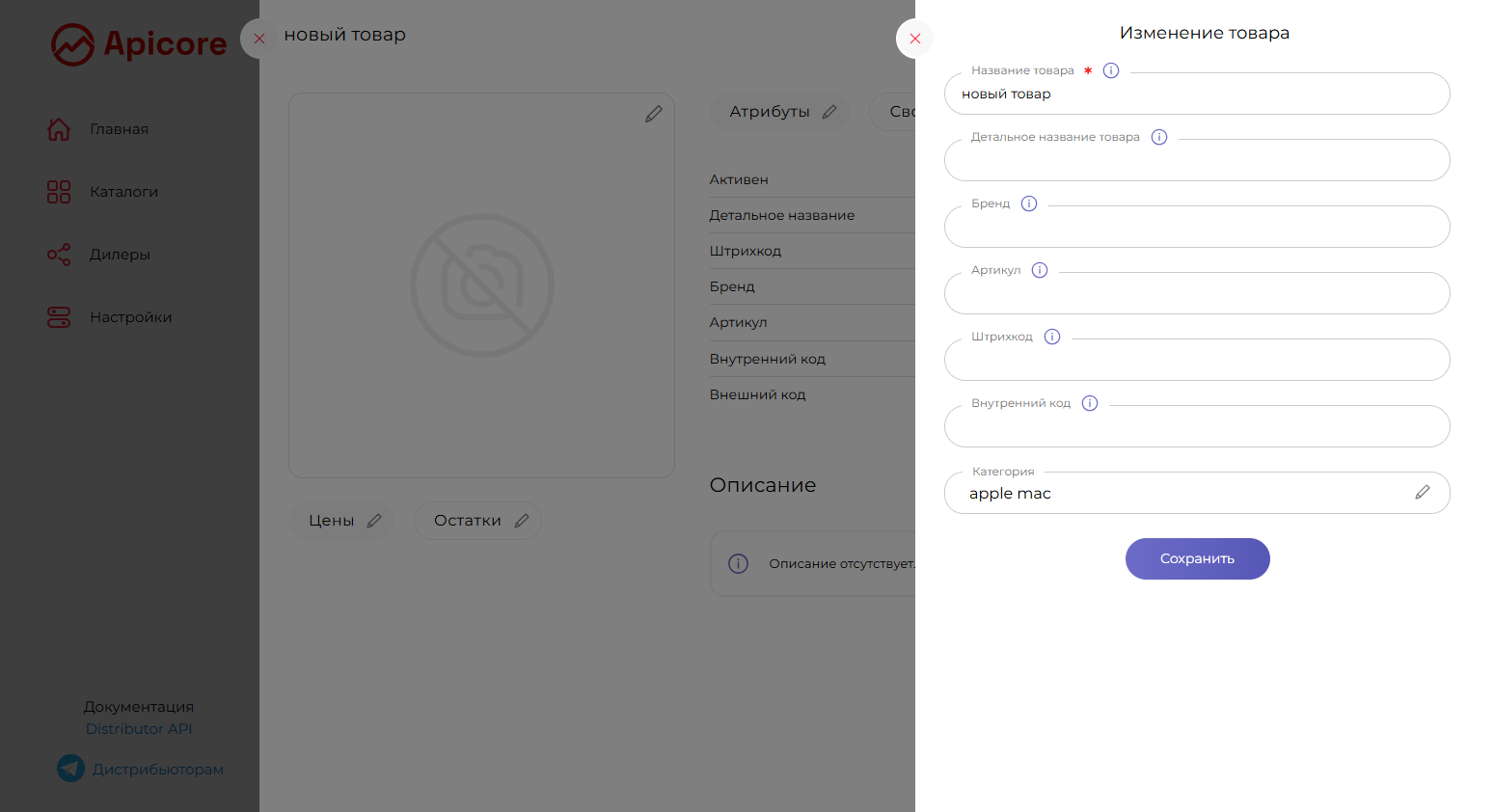 UUID — уникальный идентификатор товара в системе Apicore, необходимый для корректной интеграции и синхронизации данных между системами (1С, CRM, маркетплейсы и т.д.).