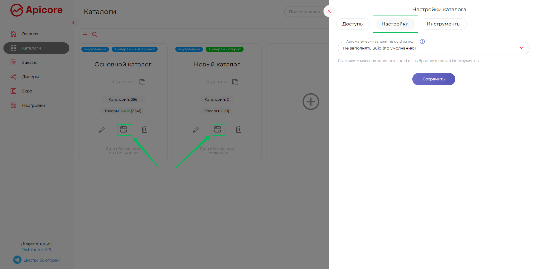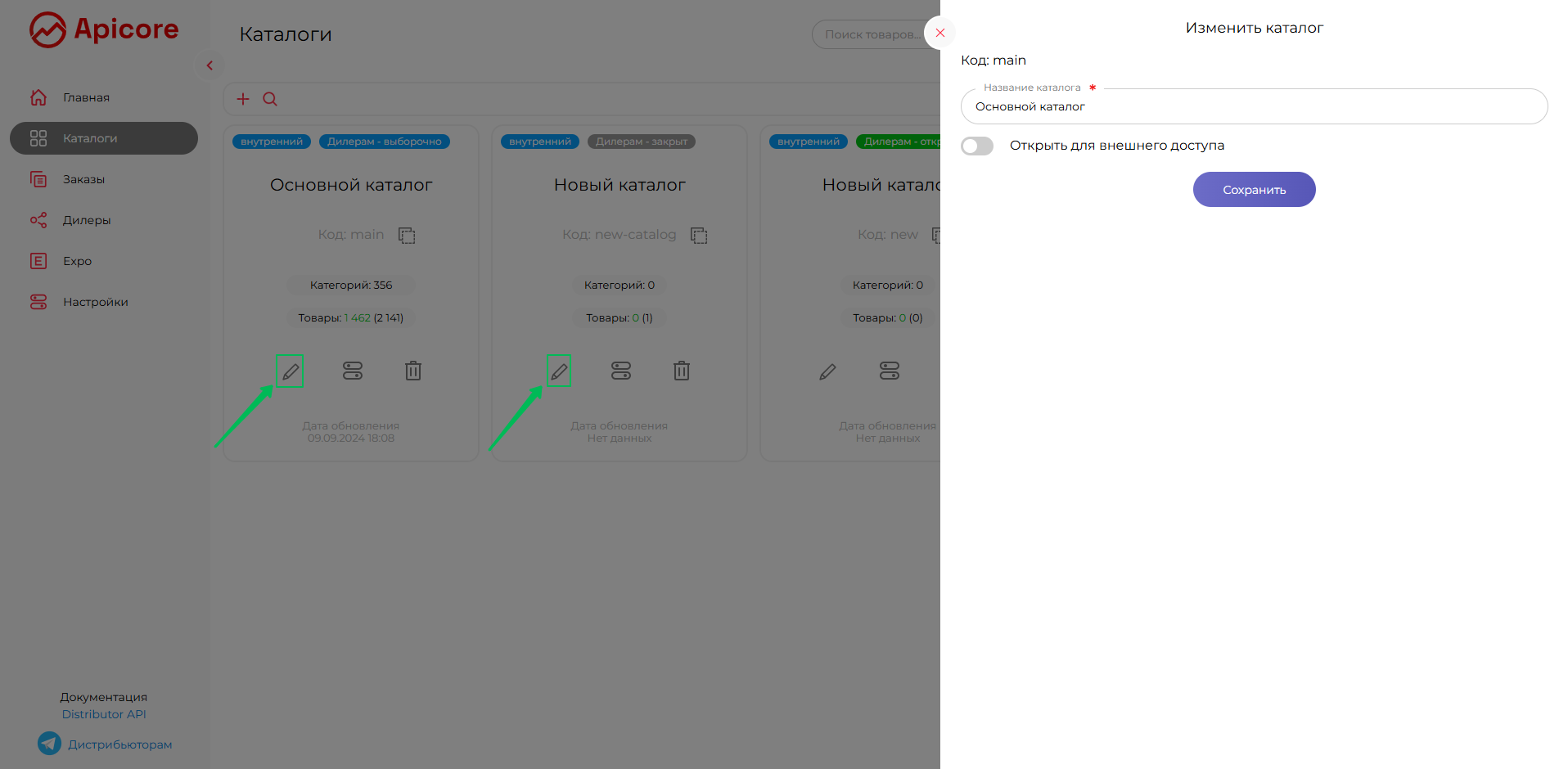 В разделе Каталоги вы можете создавать, просматривать и управлять своими каталогами товаров. Здесь доступны все основные операции — от создания нового каталога до настройки доступа и синхронизации данных через UUID.