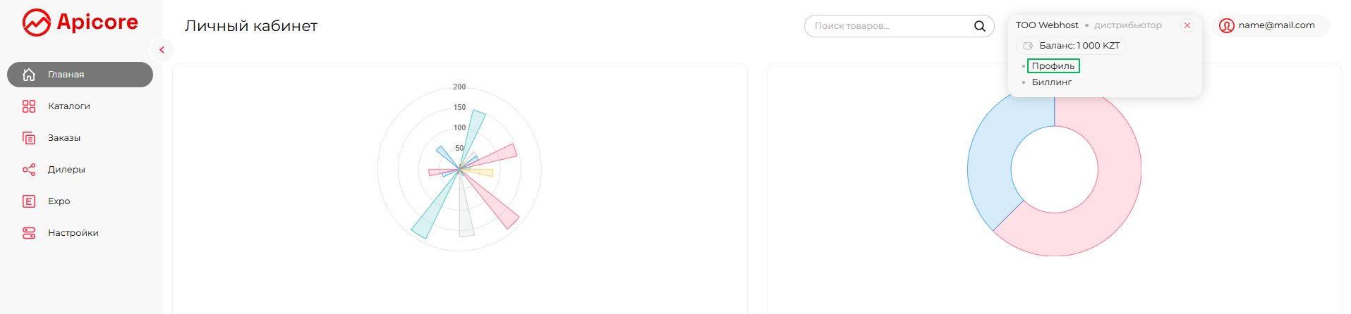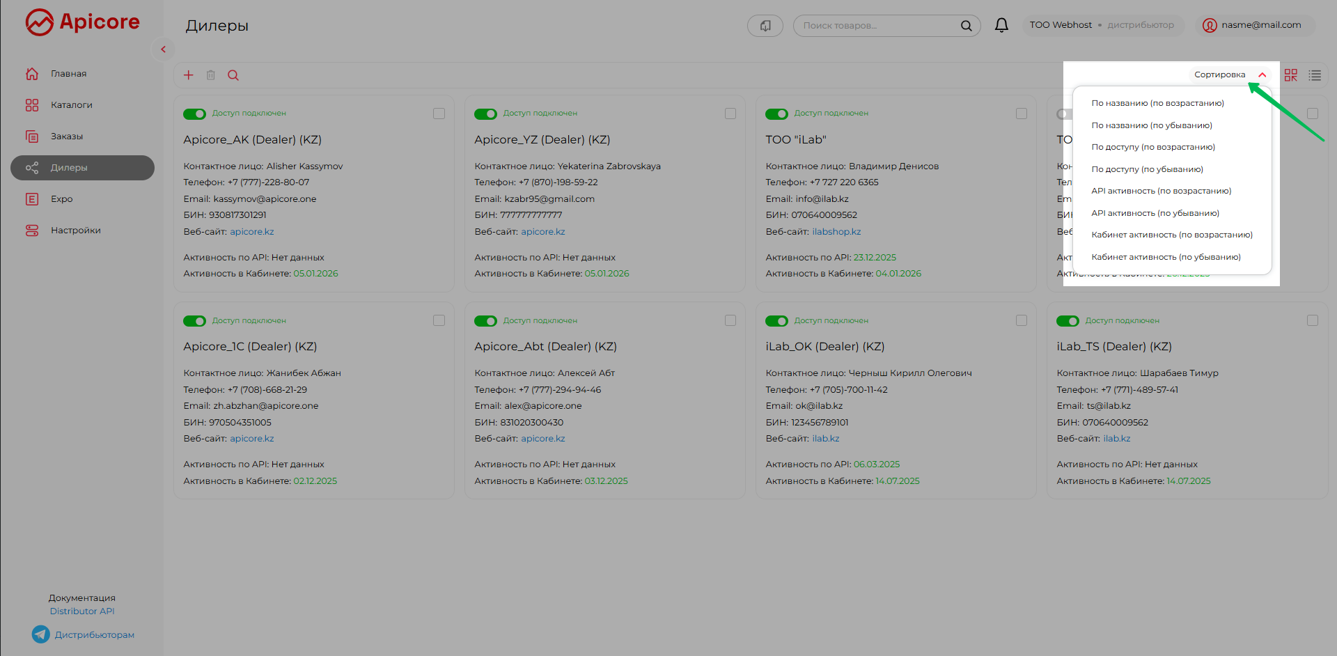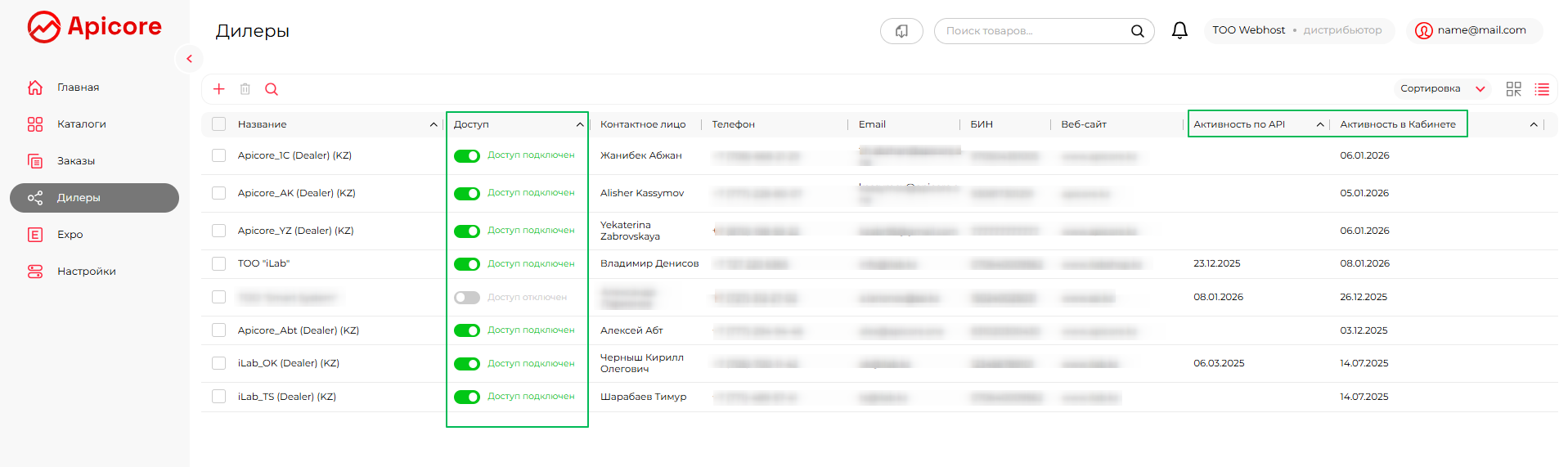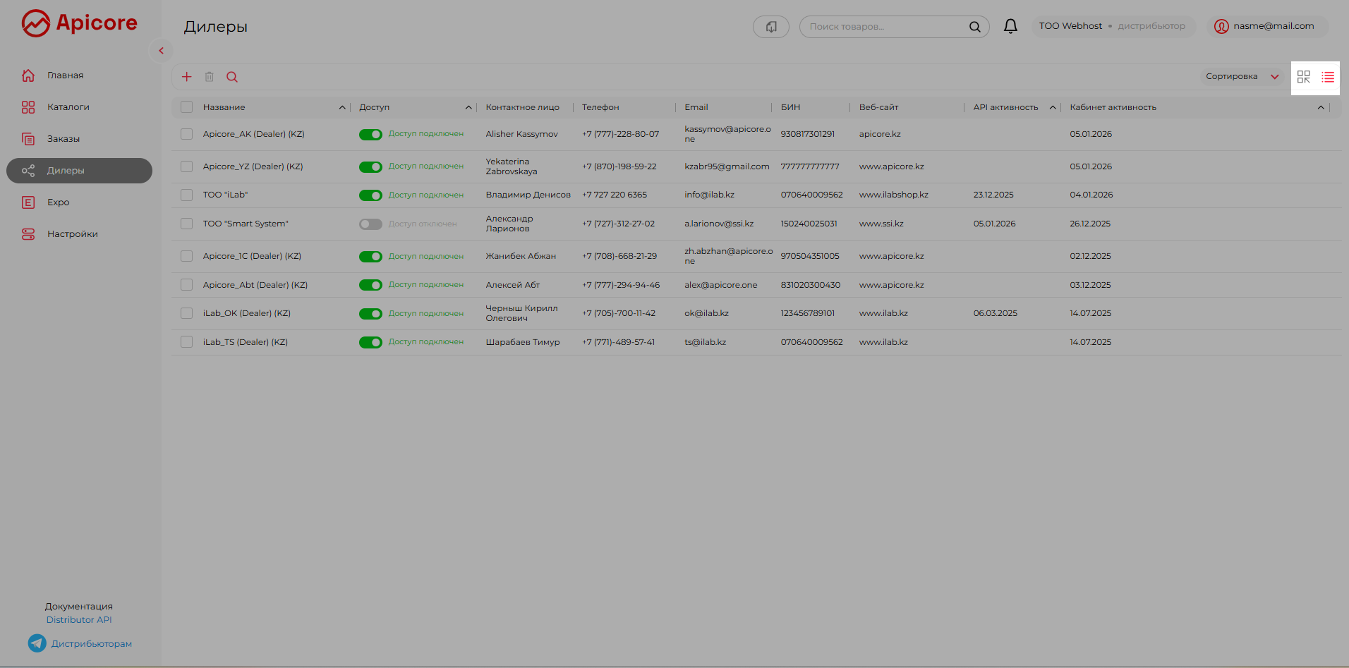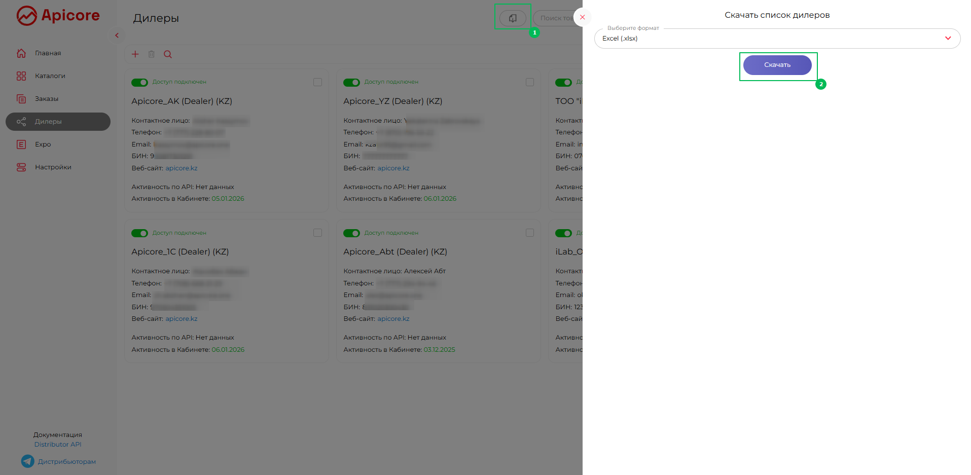 В этом разделе вы увидите всех дилеров, которые подали заявку на подключение к вашему каталогу, а также тех, кто уже подключён — как с доступом к вашему каталогу, так и без доступа. В этом разделе описано, как после публикации каталога дистрибьютор может управлять своей дилерской сетью на платформе Apicore.