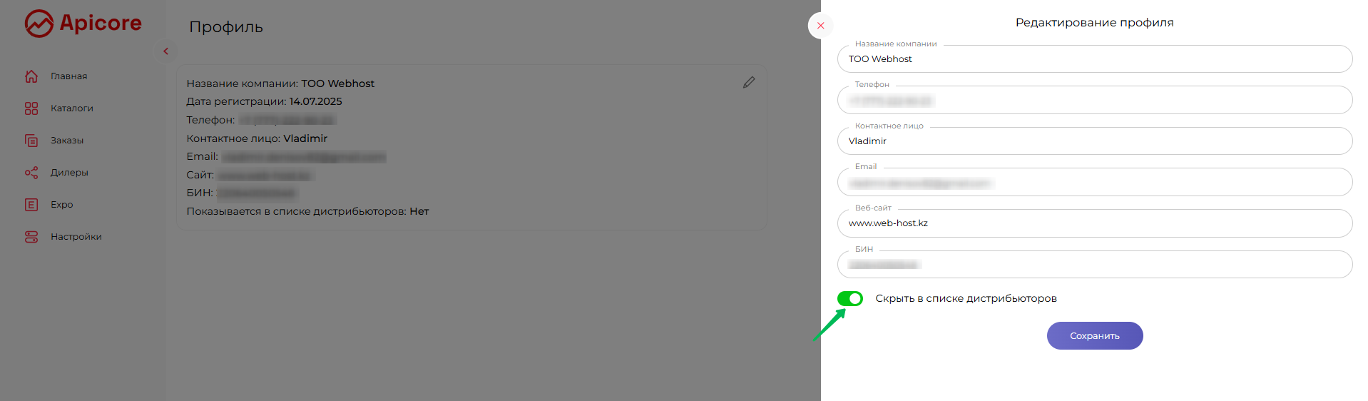 Если вы не хотите отображаться в общем списке дистрибьюторов, вы можете скрыть свою карточку: