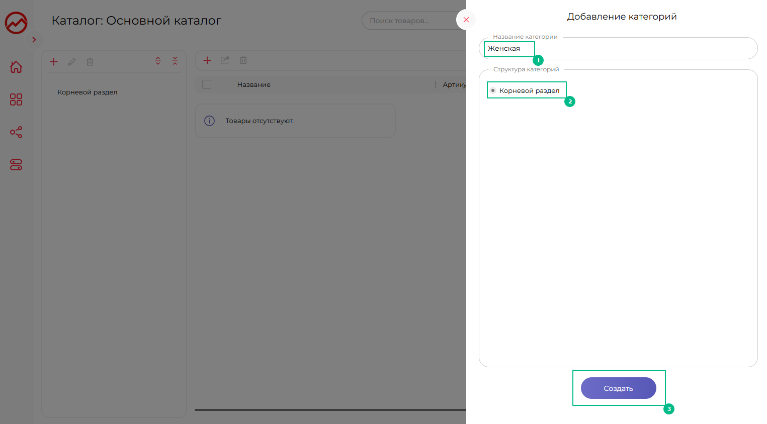 Чтобы создать структуру категорий, нажмите на иконку в колонке категорий: